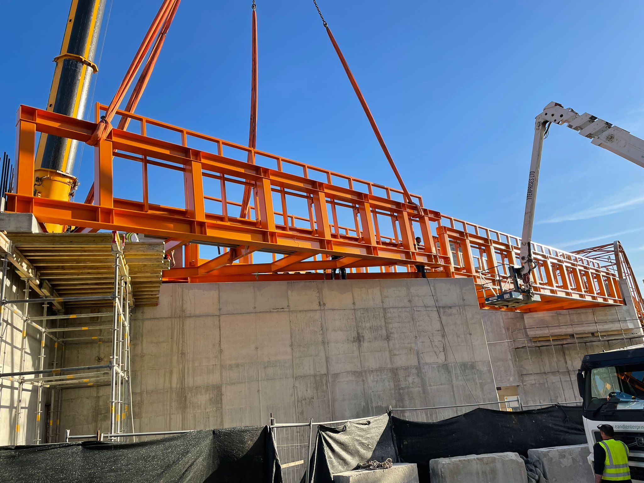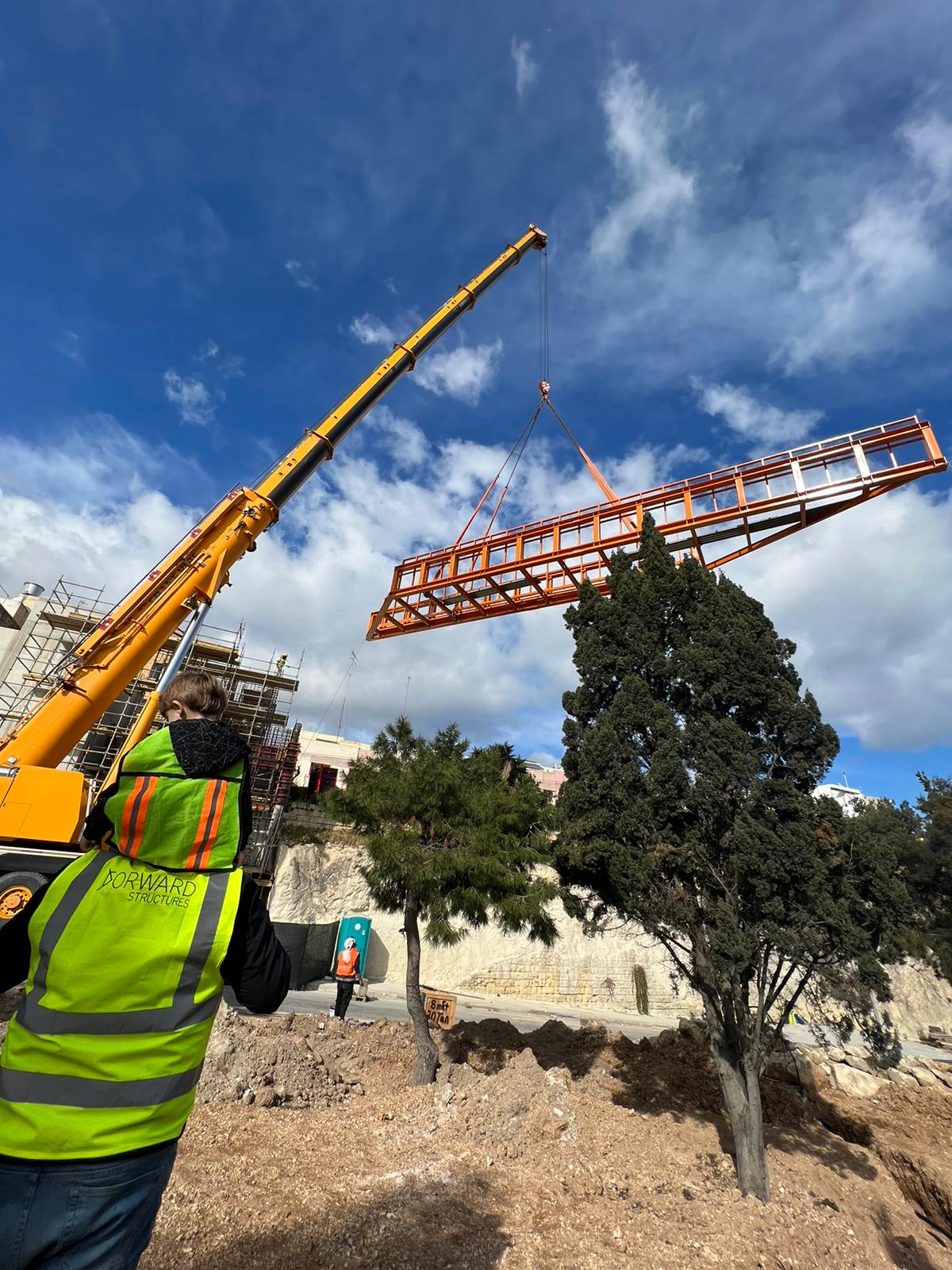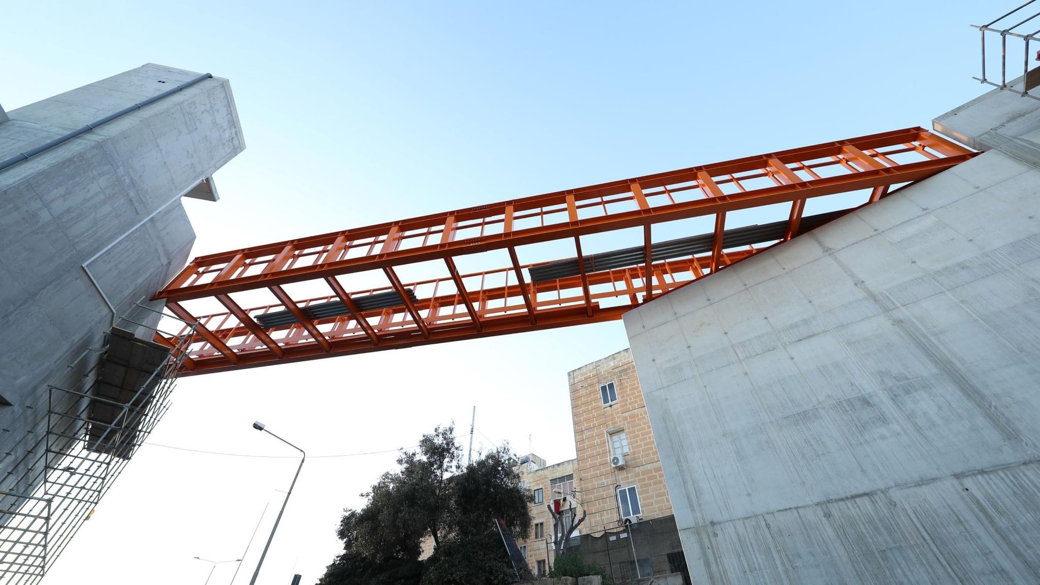 The bridge designed by Forward Structures links up to a previously erected second bridge, with the two bridges spanning across three towers. The three towers include stairways and elevators as well as lighting and surveillance cameras.